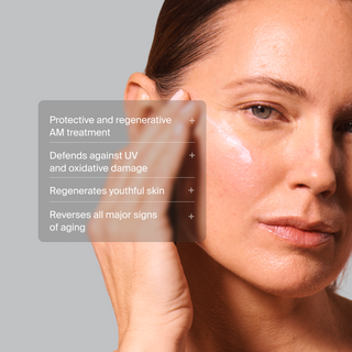 Award-winning, total skin regeneration in one step. A foundational, protective and regenerative AM therapeutic that visibly reverses existing and prevents future skin aging.